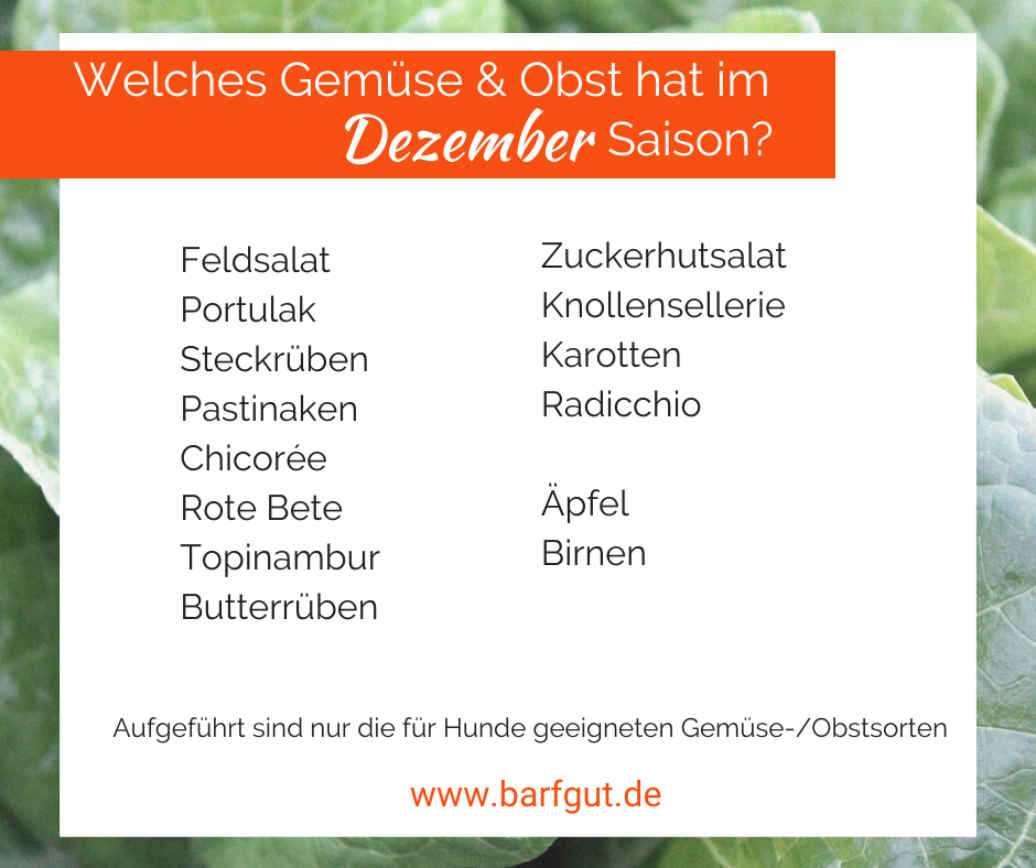 Der Saisonkalender für Gemüse und Obst sieht im Dezember ohnehin nicht besonders reichhaltig aus, aber für Hunde reduziert sich die Auswahl noch ein bisschen stärker. Denn in den Wintermonaten haben traditionell die Gemüsesorten Saison, die für Hunde wenig oder gar nicht geeignet sind. Lauch, Kohlsorten, Pilze...