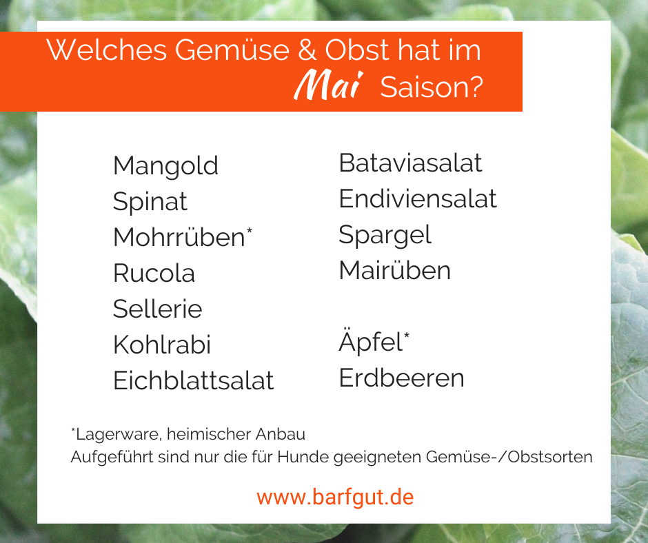 Und: Die Obstsaison für die heimischen Gemüsesorten startet im Mai mit den ersten Erdbeeren. (Yeah!) Die selbstverständlich auch Hunde bekommen dürfen: Sie sind reich an Vitamin C, Kalium und Folsäure.